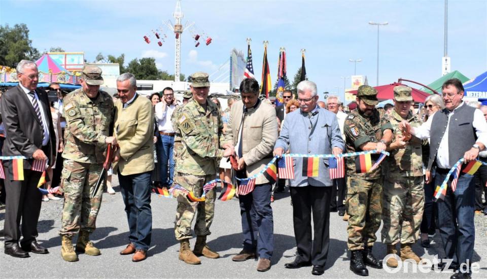 Schnipp-schnapp: Mit dem Durchschneiden des mit deutschen und amerikanischen Fähnchen geschmückten Bandes am Freitag eröffnete Colonel Adam J. Boyd zusammen mit Colonel William Glaser, Colonel Tim Davis, Bürgermeister Edgar Knobloch (Grafenwöhr), Bürgermeister Hans-Martin Schertl (Vilseck), Oberbürgermeister Kurt Seggewiß (Weiden), den beiden Präsidenten des Deutsch-Amerikanischen Gemeinsamen Ausschusses (DAGA), Helmuth Wächter und James P. Federline, sowie Oberstleutnant Florian Rommel das 61. Deutsch-Amerikanische Volksfest in der Soldatenstadt.