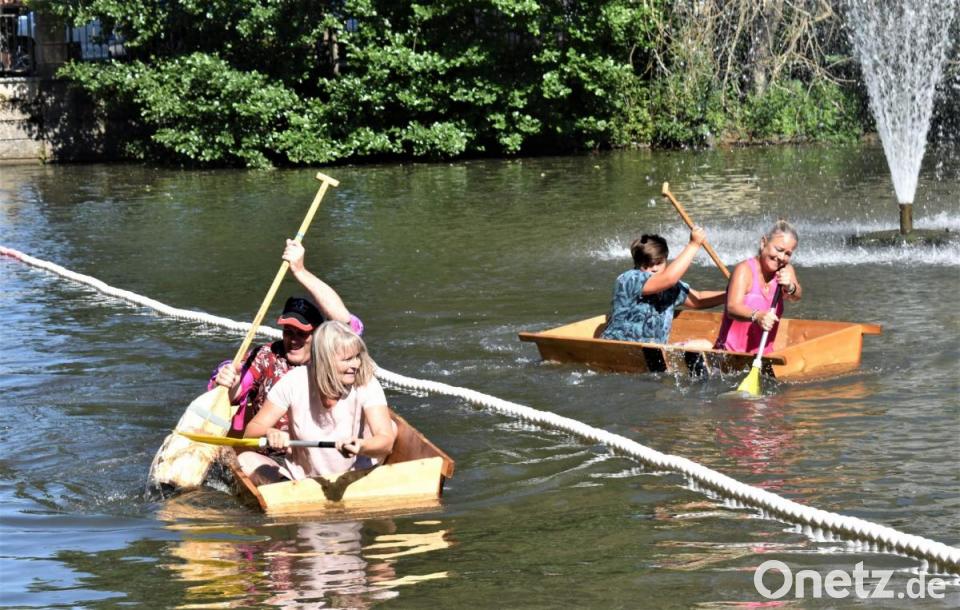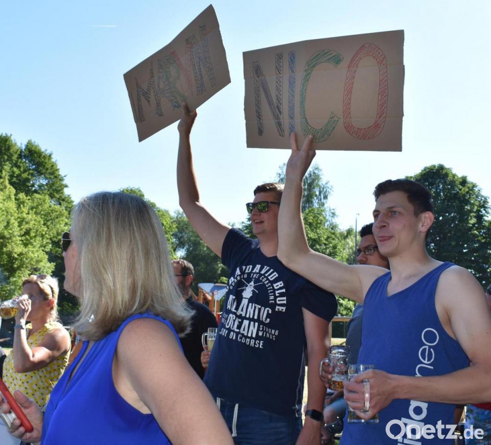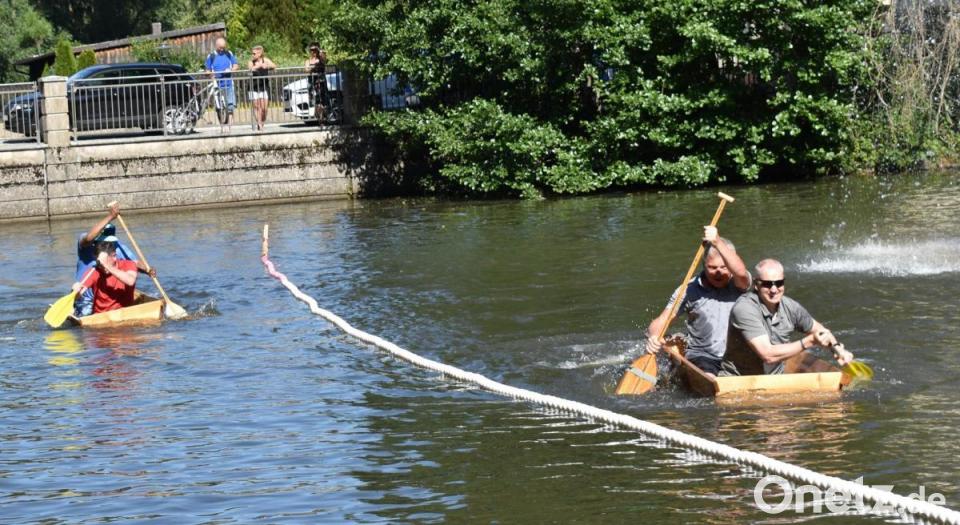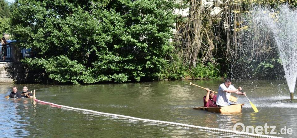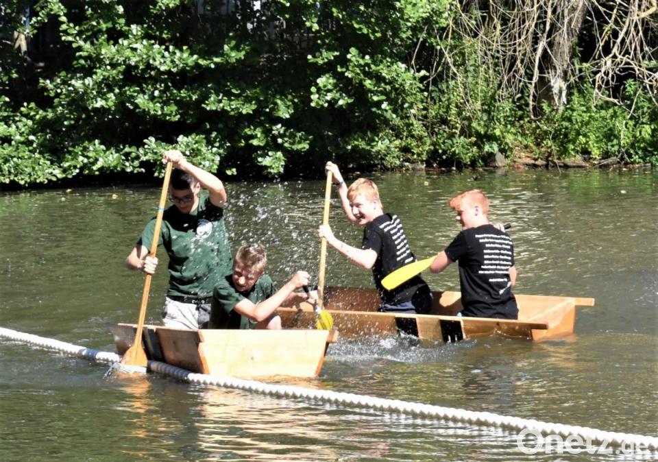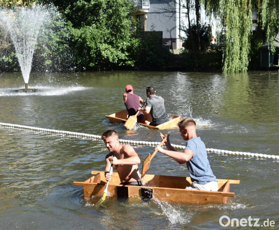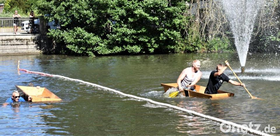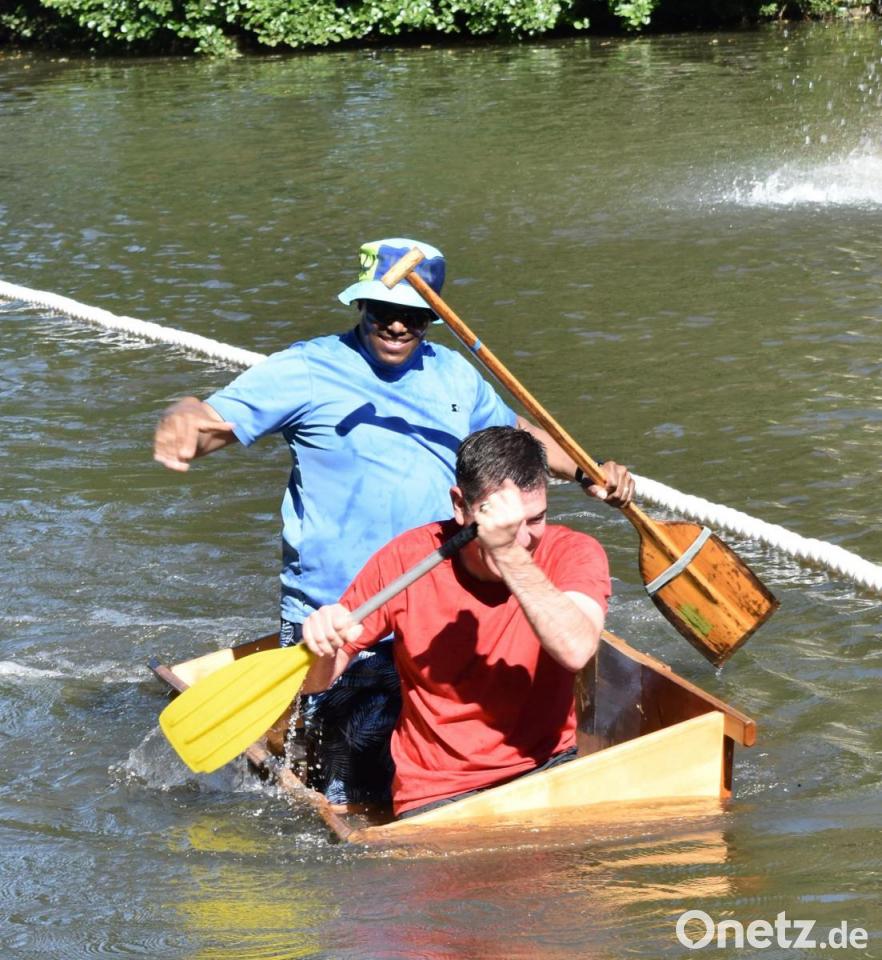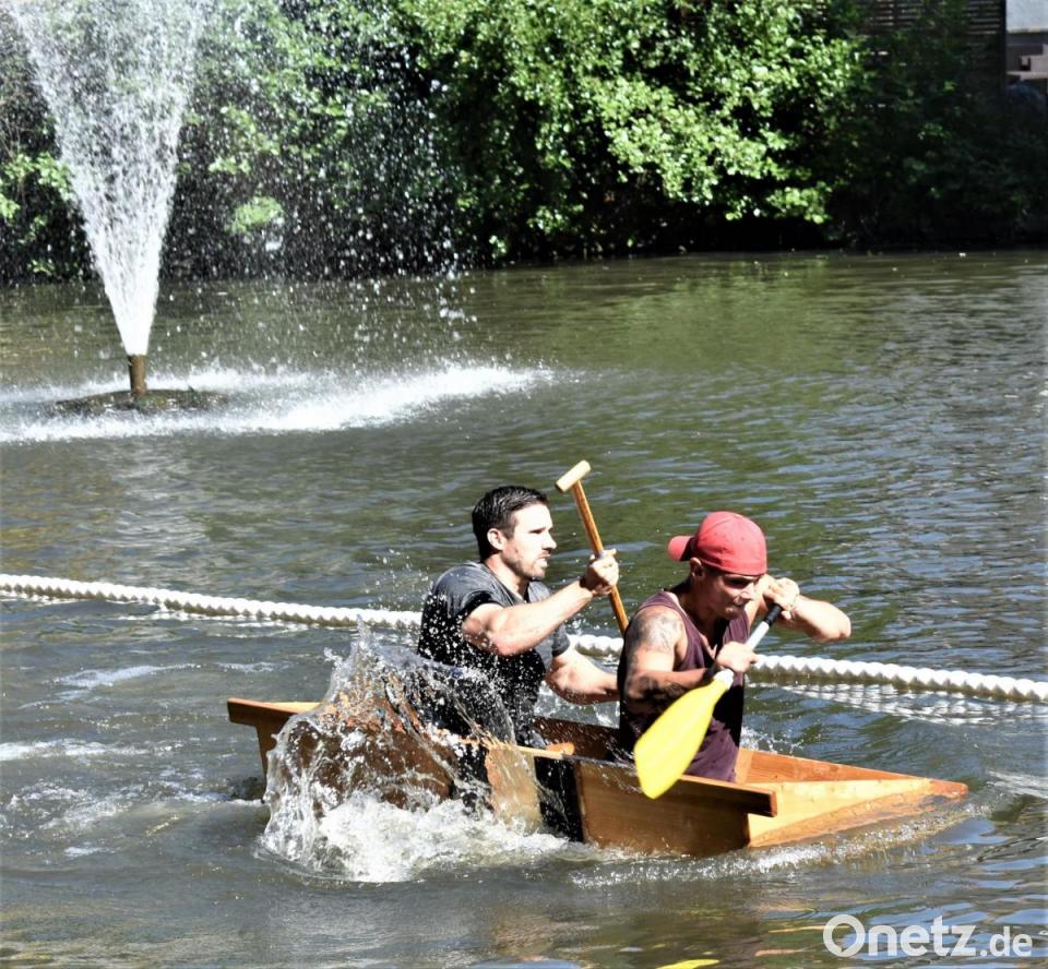 Danach wurde es spannend: Wer kann am besten mit dem Element Wasser und dem Sautrog umgehen? Auch kleine Machtkämpfe, wenn zwei Tröge aufeinander trafen, waren erlaubt. Sieger wurde die Mannschaft "Lauchconnection" mit Marvin Rankel und Nico Lebelt, die es in der Bestzeit von 1.18,86 Minuten geschafft haben, ins Ziel zu gelangen. Vielleicht motivierten sie die Namenschilder, die hochgehalten wurden? Andere brauchten dreimal so lang oder vielen kurz vorm Ziel ins Wasser - zumindest war das eine Abkühlung.