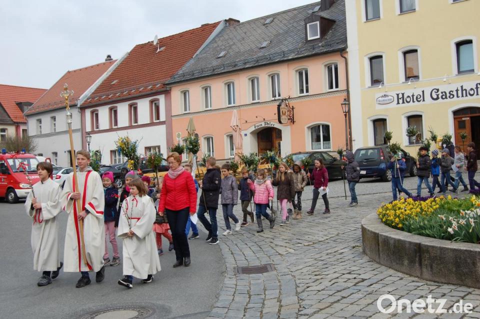 Mit diesen Worten führte Stadtpfarrer Bernhard Müller in der Alten Pfarrkirche in die Palmweihe ein. Nachdem er die Palmsträußchen gesegnet hatte, gaben Kinder in ihrem Sprechspiel „Ein ganz normaler Tag“ einen kleinen Einblick in das karge Leben der Menschen damals in Jerusalem. Es gipfelte sehnsuchtsvoll in der Feststellung nach einem Leben ohne Ungerechtigkeit und Not. Mit der überraschenden Nachricht eines aufgeregten Jungen, „Jesus kommt“, wurde ein triumphaler Tag daraus. Doch sei Jesus nicht etwa auf einem Pferd, sondern auf einem Esel, „dem Reittier der kleinen Leute“ eingezogen. Gemeindereferentin Christine Gössl und Praktikantin Laura Maurer hatten die Szene mit den Kindern vorbereitet. Gemäß der Historie, zogen die Gläubigen anschließend betend und singend von der Alten Pfarrkirche zur Friedenskirche, voran die Erstkommunikanten mit ihren selbst gefertigten Palmbuschen. Im Rahmen des Gottesdienstes dort wurde mit der Verlesung der Passion offiziell die Karwoche eröffnet. Die gesegneten Palmsträußchen trugen die Menschen nach Hause oder auf die Gräber zu ihren Lieben. Mit dem Kauf unterstützten sie gleichzeitig missionarische Aufgaben in der Einen Welt.
