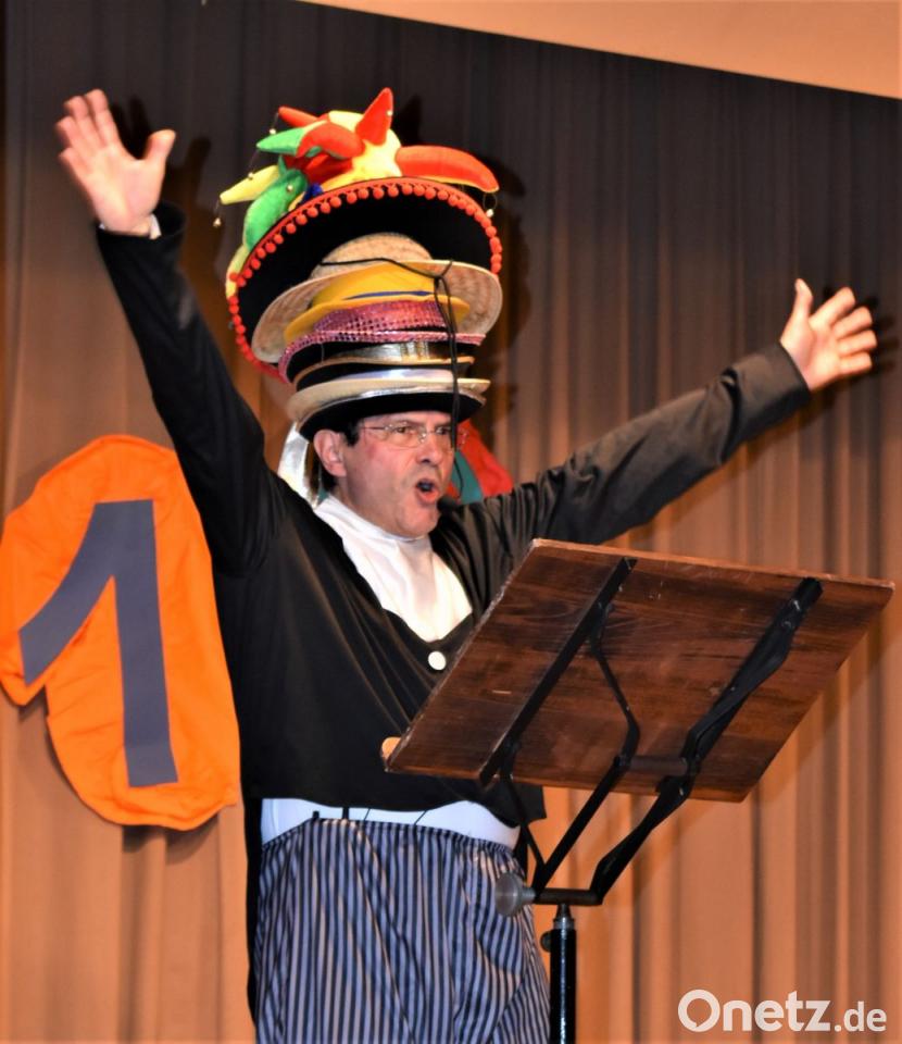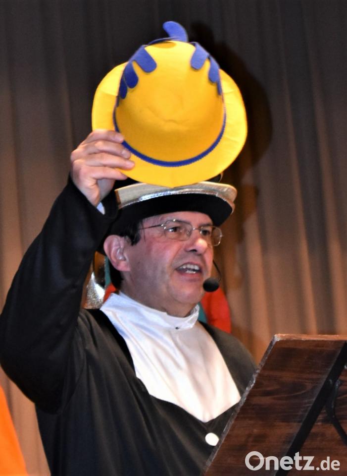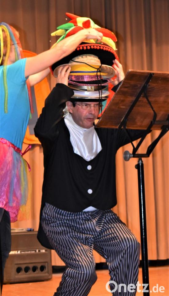 Da das Faschingsoutfit von Pfarrer Bernhard Müller viele Hüte beinhaltet, konnte er sich kaum entscheiden, welcher Hut es dieses Mal sein sollte. Also mussten gleich alle zwölf Exemplare auf seinen Kopf wandern. Das ganze wurde musikalisch begleitet. In zwei weiteren Liedern bewies der Pfarrer einmal mehr seine Reimkunst.