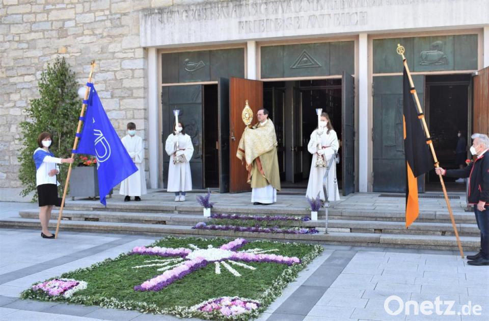 Kurzentschlossen legten einige Mitglieder des Katholischen Frauenbundes in aller Frühe nach Absprache mit Pfarrer Bernhard Müller einen Blumenteppich vor der Friedenskirche. Schon vor dem Festgottesdienst zog dieser bewundernde Blicke der Gläubigen auf sich. Nach der heiligen Messe ging Pfarrer Bernhard Müller vor das Gotteshaus und segnete mit der Monstranz die ganze Stadt.