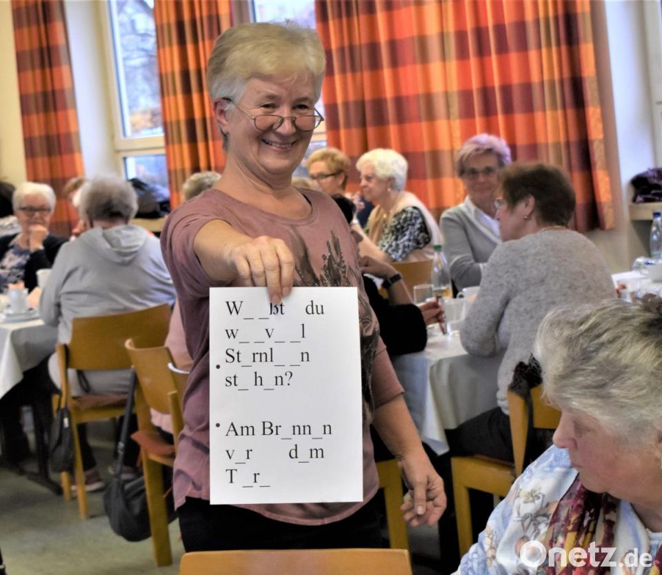 Nachdem die Senioren mit Kaffee und Kuchen versorgt waren, trug Marianne Schneider ein Begrüßungsgedicht vor. Danach gab es für die Senioren eine Bildergeschichte, die gar nicht so einfach zu lösen war. Das logische Denken wurde auch mit Rätseln aktiviert, wie beispielsweise: "Wer läuft und kommt niemals ans Ziel?" Die Lösung: Die Nase. Schneider stellte auch das "Süßigkeitsrätsel" vor und lud zum Singen von bekannten Liedern ein, die jedoch abgewandelt wurden. Anstatt dem Zigeunerleben war das Rentnerleben lustig. Dass das Lächeln wichtig ist, besagte das Gedicht: "Lächeln dreimal täglich, dazu frischen Mut, dann wird die Welt erträglich."