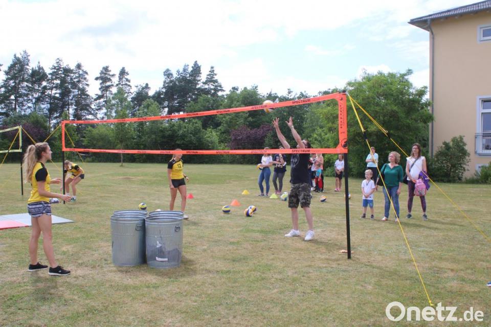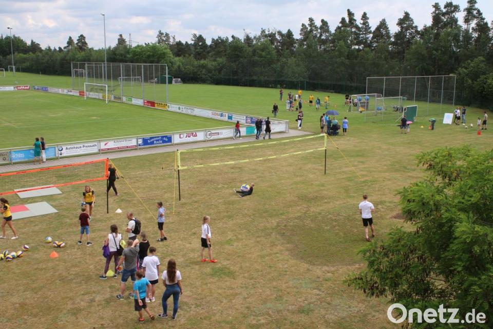 Die größte Anlage war die Volleyballer, die zwei Netze aufgebaut hatten. Zunächst galt es, nach einem Zuspiel den Ball über das Netz in große Metalltonnen zu pritschen. Anschließend mussten die Teams noch mit Aufschlägen Matten auf der anderen Seite des Feldes treffen. Jeder Spieler hatte je zehn Versuche. Einen Beachvolleyball gewann hier Familie Herold mit 19 Punkten.