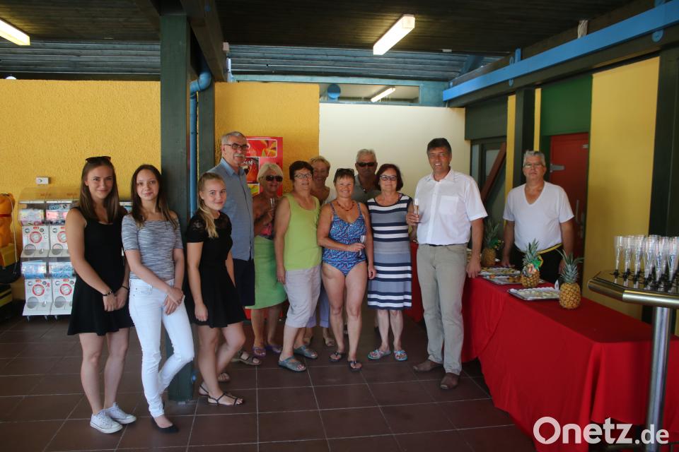 Eine ruhige Gelegenheit, Momente der Vergangenheit auszutauschen, bevor der Nachmittagstrubel der Feierlichkeiten losging, gab es am Jahrestag des Freibades beim offiziellen Sektempfang. Alle Jahreskartenbesitzer waren von der Stadt eingeladen, sich mit Bürgermeister Edgar Knobloch bei einem Glas Sekt und kleinen Häppchen über aktuelle und vergangene Geschehnisse im Bad auszutauschen, was bei Alt und Jung auch regen Anklang fand. Kioskpächter Michael Brumbach hatte sich Mühe gegeben, den Geschmack von jedermann zu treffen und ein reichhaltiges Büffet zu präsentieren. Knobloch meinte, dass das Bad trotz seiner stolzen 40 Jahren in einem guten Zustand ist, was an der fachgerechten Wartung durch das Personal des Bades liegt. Stets geht man mit den Anforderungen der Zeit, und so wurde das Bad barrierefrei, eine Behindertentoilette wurde installiert und es wurden immer neue Attraktionen hinzugefügt. Nichtsdestotrotz steht bald eine große Sanierung an, damit das Bad auch für die Zukunft attraktiv bleiben wird. An die Eröffnung am 24. Juli 1978 kann sich Knobloch sogar noch erinnern - kurz vorher hatte er sich als Jugendlicher beim Handballspielen den Arm gebrochen und ließ es sich nicht nehmen, trotz Gips ins Wasser zu springen. Im Nachhinein keine gute Idee, schmunzelt das Stadtoberhaupt.