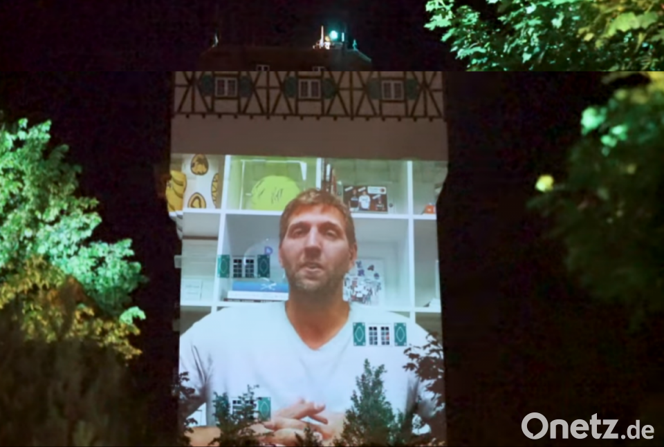 An den Wasserturm auf dem Truppenübungsplatz Grafenwöhr werden während der Corona-Pandemie regelmäßig aufmunternde Botschaften projiziert. Dieses Mal richtet mit Ex-Basketball-Profi Dirk Nowitzki ein waschechter Bayer einige Worte an die US-Soldaten. "Servus Bayern, ich hoffe, dass ihr alle gesund bleibt. In dieser unsicheren Zeit ist es toll zu sehen, dass alle zusammenhalten und sich unterstützen", lautet der erste Satz der Botschaft.