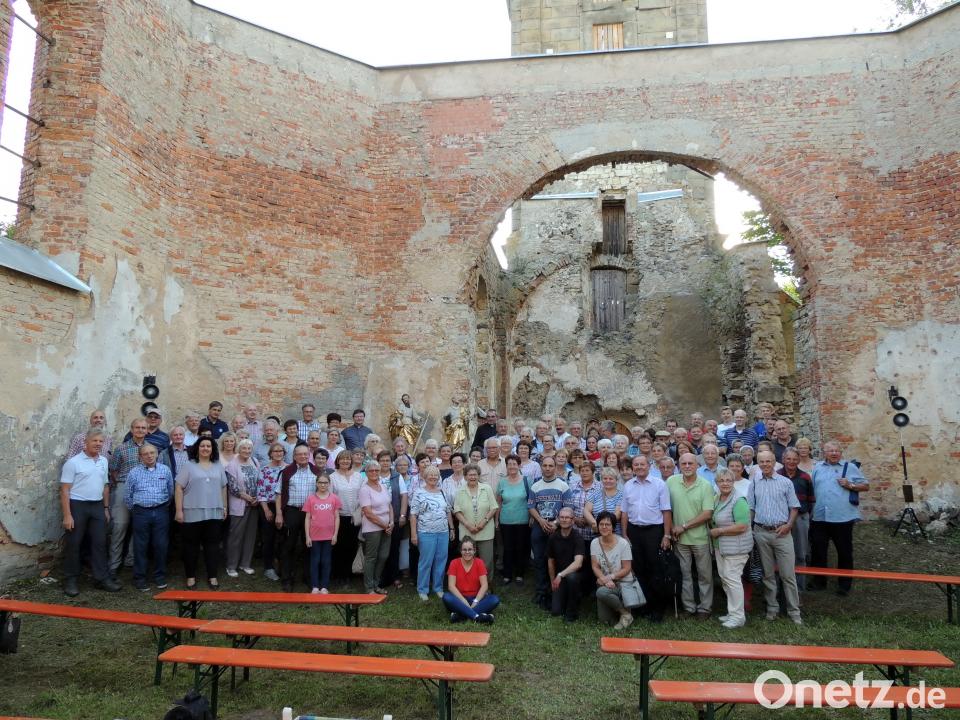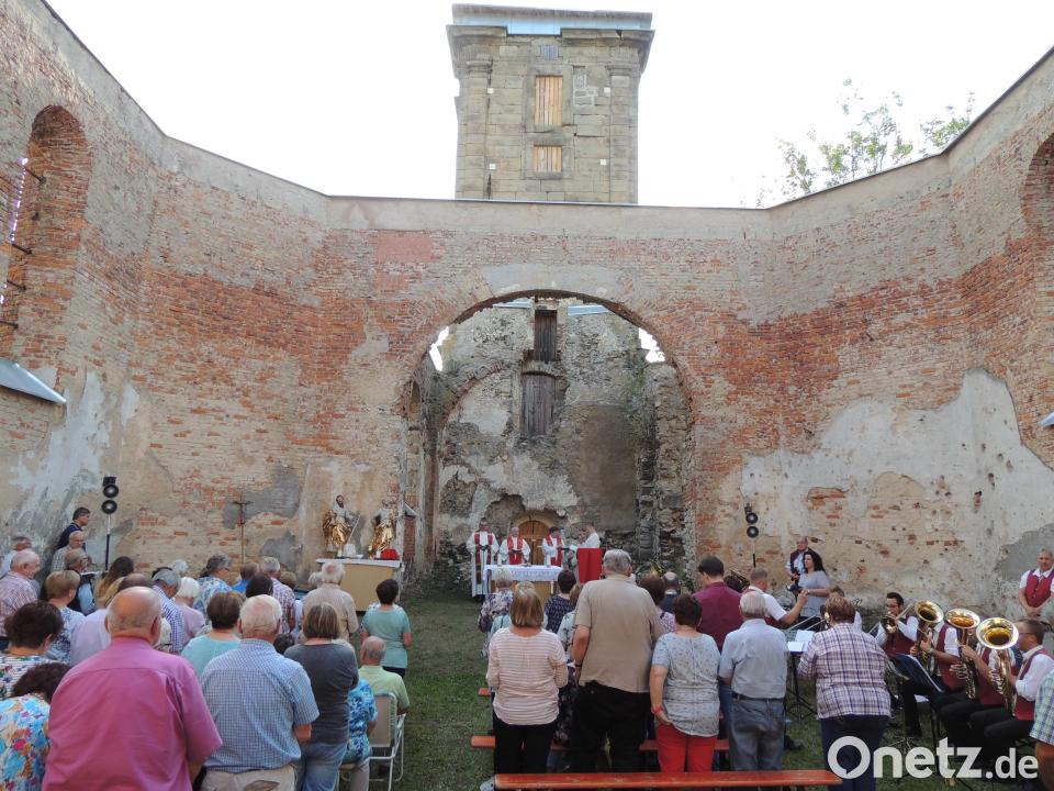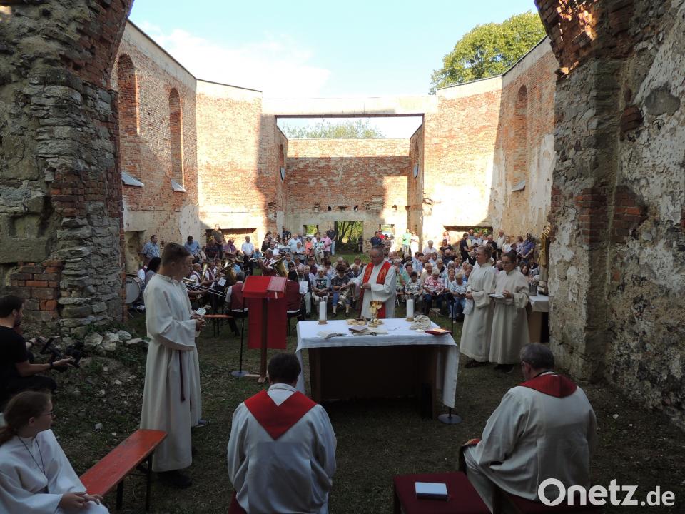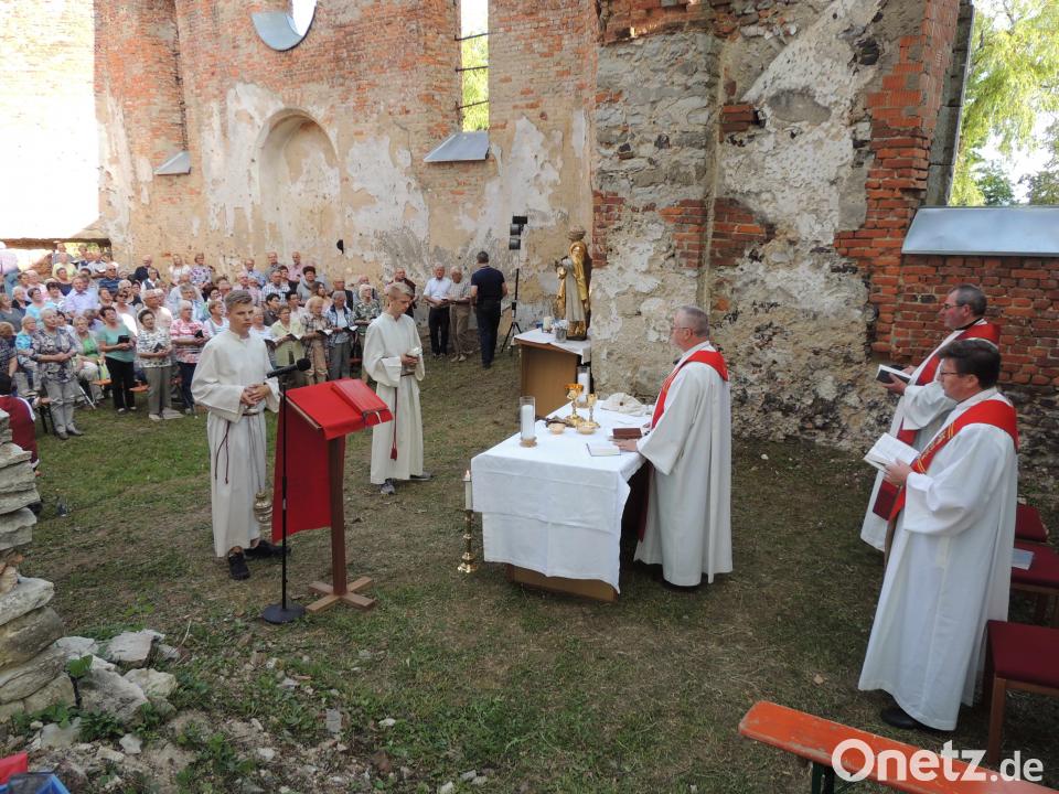 (mor) „Von Ruinen geht eine Kraft aus, welche die Botschaft der Apostel Peter und Paul weit über die Zeit hinausträgt“, sagte Regionaldekan Josef Zerndl, der am Hochfest Peter und Paul mit weiteren 150 Gläubigen einen Gottesdienst in der Kirchenruine des verlassenen Übungsplatzdorfes Hopfenohe feierte. Für die Fahrt und den Gottesdienst war das 200-jährige Bestehen des Dekanats Auerbach der Anlass. Erinnert wurde dabei auch an die Absiedelung von Hopfenohe vor 80 Jahren.