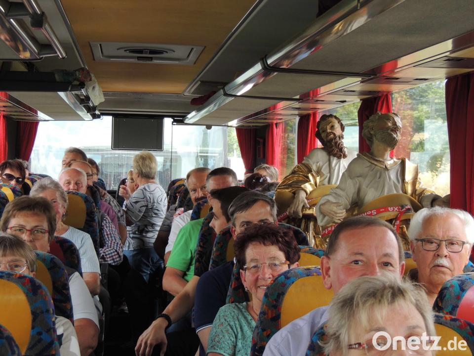 Ungewöhnliche Mitfahrer: Die beiden Kirchenstatuen Peter und Paul „saßen“ in einem der drei Busse, welche zur Rundfahrt in den Übungsplatz und nach Hopfenohe aufbrachen. Die US-Armee-Garnison Bavaria ermöglichte die Fahrt der ehemaligen Hopfenoher und Gläubigen aus dem Dekanat. Als fachkundige Begleiter erwiesen sich Josef Neubauer, Andre Potzler und Gerald Morgenstern. Beginnend bei der neuen Kirche auf dem Netzaberg und im Hauptlager rund um den Wasserturm erläuterten sie die Geschichte des Truppenübungsplatzes und gaben Informationen zur aktuellen Situation. Vorbei an der Wolfschützenkapelle wurde Halt auf dem Schwarzenberg eingelegt und dort die Ausdehnung und Nutzung des militärischen Übungsareals erläutert. Besucht wurde auch der Gottesacker des größten Übungsplatzdorfes Haag, 1992 wurde der Friedhof saniert und ist seither auch Anlaufpunkt von Besuchern.