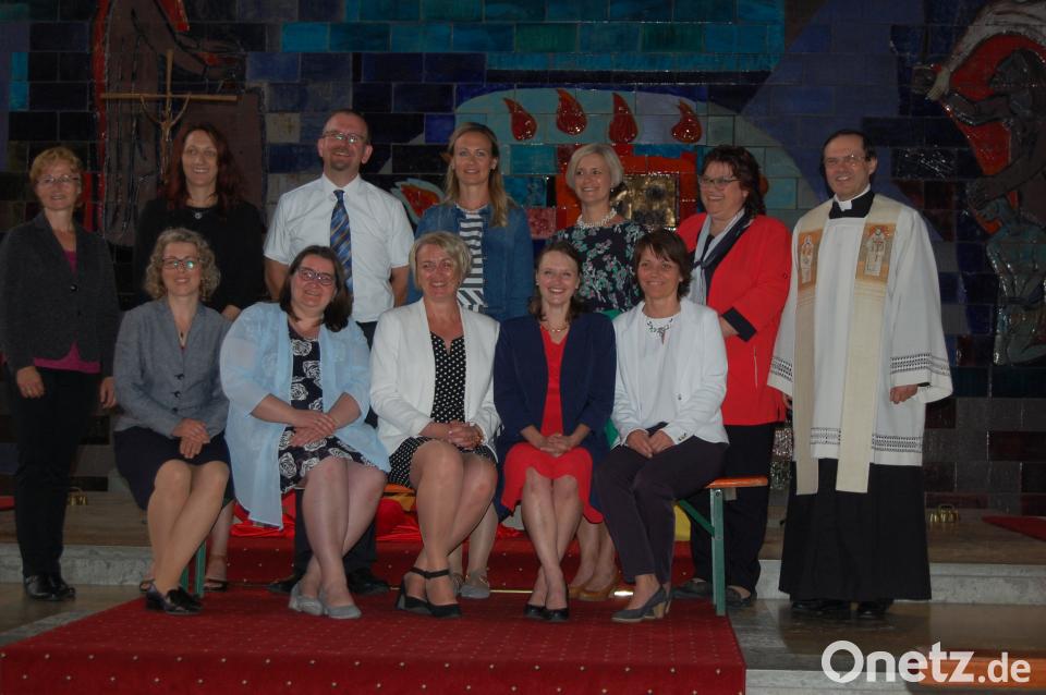 Diese Tischmütter (auch zwei Väter waren dabei) Harald Bosch, Stephan Brändl, Ulrike Kneidl, Renate Hofmann, Christine Klaaß, Michaele Keck-Neidull, Barbara Stock, Simone Sieber, Sandra Thometzki, Sybille Wohlmann und Claudia Wolf haben sich für den wichtigen Dienst an Kindern in die "freiwillige Pflicht" nehmen lassen und dabei auch selbst wertvolle Erfahrungen gesammelt. Rechts Stadtpfarrer Bernhard Müller, links Gemeindereferentin Christine Gössl. Bild: az
