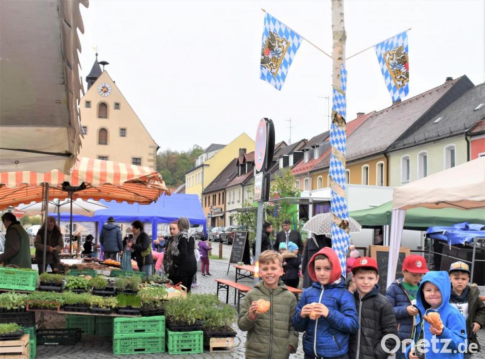 Neben den Besuchern des Wochenmarktes beziehungsweise Maifestes kamen leider auch viele Regentropfen vom Himmel. Trotzdem machten sich neben den Erwachsenen auch einige Schulklassen auf den Weg zum Rathaus. Dort ließen es sich die Buben und Mädchen Kuchen, Bratwurstsemmel, Pommes oder Pizza schmecken, bevor es wieder zum Lernen in die Schule ging.