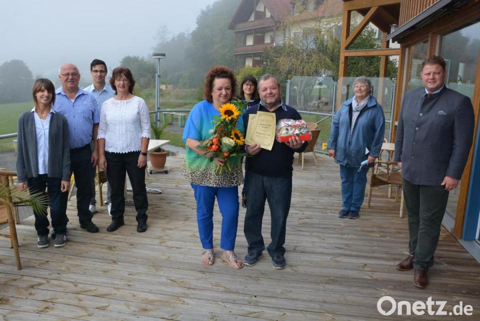 Mehrmals pro Jahr kommen Monika und Heinz Farrenkopf aus Walldürn (Neckar-Odenwald-Kreis) nach Großbüchlberg, um in der Bergpension der Familie Lang Urlaub zu machen - und das schon seit 25 Jahren. Dies nahmen die Gastgeber und die Stadt Mitterteich nun zum Anlass, um sich bei dem Ehepaar aus Baden-Württemberg für die Treue zum Urlaubsort zu bedanken.