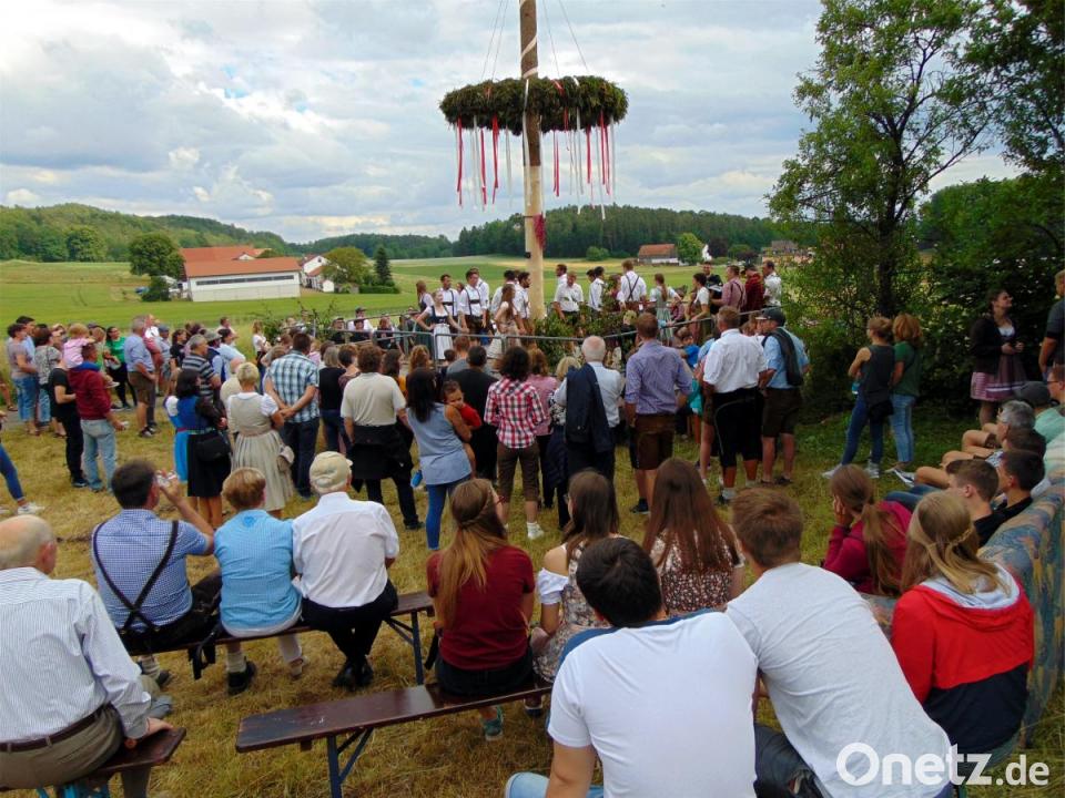 Angeführt von Kindern mit der "Kirwafahne", dem Bätzen und den Fasslfahrern marschierten dann am Nachmittag die neun Kirwapaare am Festplatz ein. Musikalisch begleitet von "D'Allerscheynst'n" (sie gestalteten auch den Abend) wurden die vielen einstudierten Tänze um den Baum dargeboten.