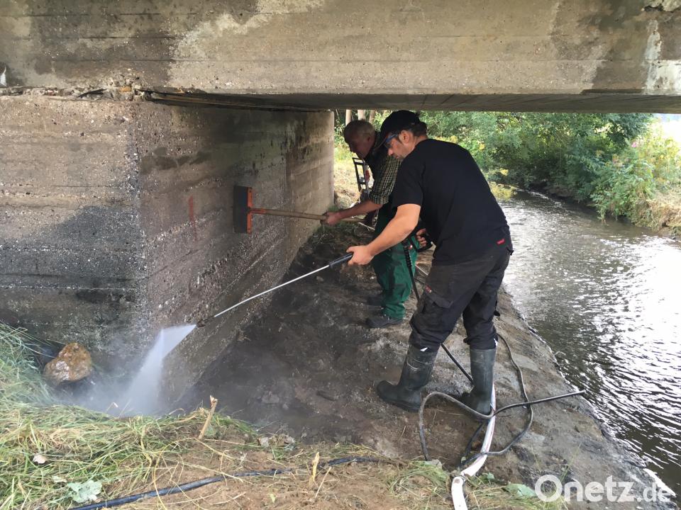 Der Bürgermeister freut sich über den Vorteil, bauerfahrene Handwerker mit viel Wissen zu haben, die auch anpacken können. An der Brücke in Großensees waren sie schon. Am Ortseingang fließt die Wondreb derzeit auf Niedrigwasser. Burger und seine Mannen halten vor allem nach versteckten Mängeln Ausschau. Weiter arbeiten sie die Mängel ab, die ein Brückengutachter festgestellt hat. In Großensees wurde so zum Beispiel das Flußbett wieder befestigt, damit die Wondreb nicht die Fundamente der Brücke beschädigen kann.