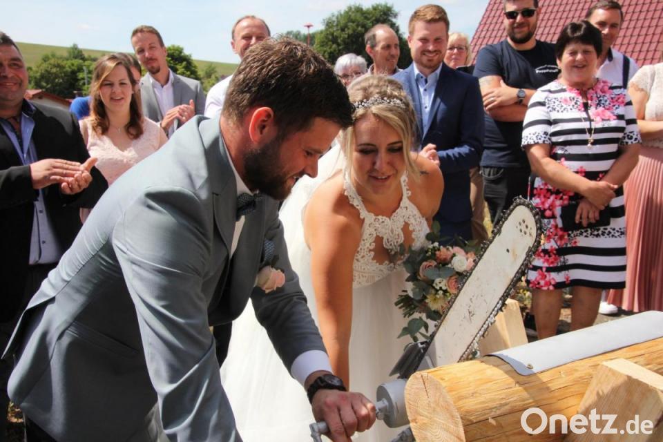 Die erste Aufgabe des Brautpaares war es mit einer Sägebock-Handkettensäge der Marke Eigenbau, eine Scheibe von einem Holzstamm abzusägen, was beiden in hervorragender Zusammenarbeit und unter kräftigem Applaus gelang. Danach ging es mit einem Rückezug, der in aufwendiger Arbeit von den Arbeitskollegen zum „Brautauto“ umgebaut wurde, im Konvoi nach Poppenreuth. Dort fand mit rund 170 Hochzeitsgästen in der heimischen Maschinenhalle die Hochzeitsfeier statt. Am Abend spielte die Party-Band „Loops“ aus Regensburg auf. Das junge Paar wohnt in Poppenreuth. Kennengelernt haben sich beide 2014 in einer Diskothek in Tirschenreuth.
