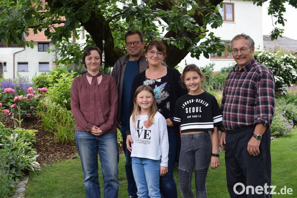 (von links) die beiden Kreisfachberater für Gartenkultur und Landespflege am Landratsamt Tirschenreuth Manuela Pappenberger und Harald Schlöger, Christine Benkner mit zwei von drei Töchtern sowie Alfred Benkner, OGV-Vorsitzender Großkonreuth.