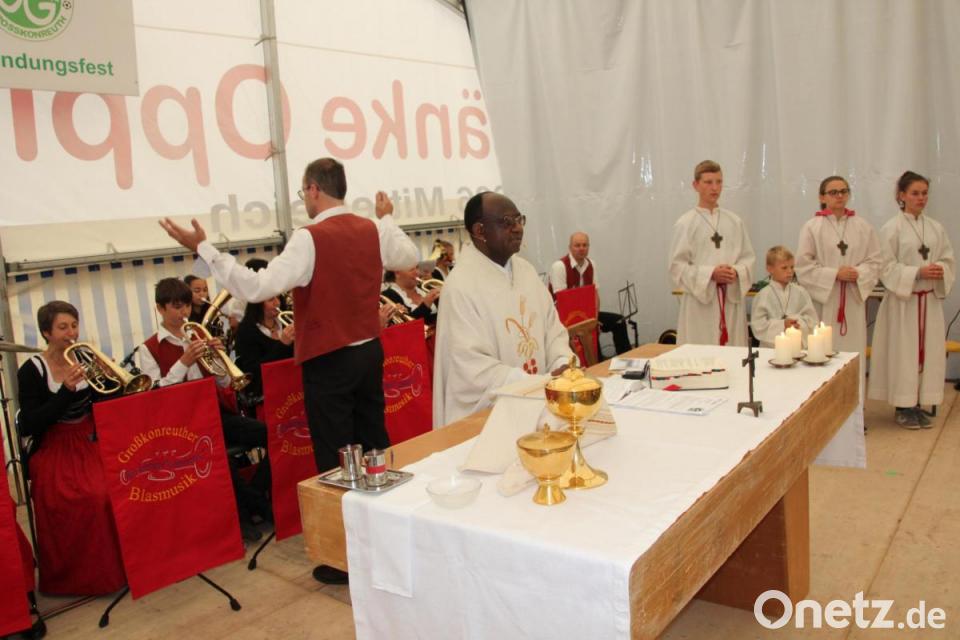 Ein Kirchenzug und ein Festgottesdienst durften beim Jubiläum anlässlich des 45-jährigen Bestehens der Sportgemeinschaft nicht fehlen. 15 Vereinen, angeführt von der Großkonreuther Blasmusik, marschierten am Sonntag zur Messe im Festzelt. Pfarrer Charles Ifemeje freute sich in seiner Predigt, dass ein Festgottesdienst in dieses Vereinsjubiläum mit eingebunden sei. Dies sei auch wichtig, denn es bestehe eine Partnerschaft zwischen Gott und den Menschen. Der Gottesdienst, so der Prediger, sei etwas ganz Besonderes, denn dieser Gottesdienst finde nicht in der Kirche, sondern im Festzelt auf dem Sportplatz statt. Er persönlich sei sowohl am Freitag auf der Beachparty als auch am Samstag in der "Nacht der Tracht" anwesend gewesen. Am Samstag sogar in seiner nigerianischen Tracht.
