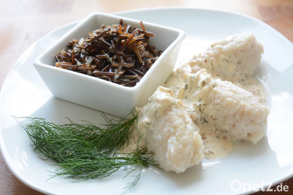 Für die Soße zwei Schalotten fein hacken und in Butter dünsten. Sie dürfen nicht braun werden. Die Crème fraîche zu den Schalotten geben und mit dem Weißwein ablöschen. Den Dill fein gehackt zufügen und einige Minuten köcheln lassen. Dazu passt Wildreis. (nd)