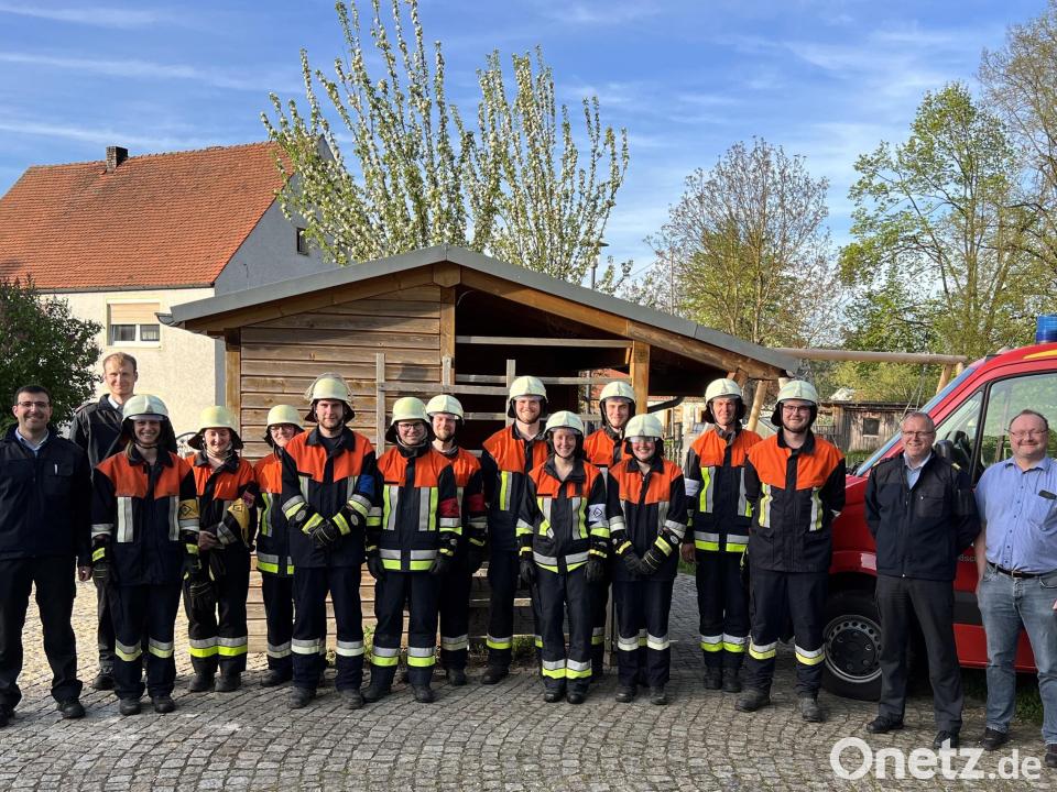 Stolz zeigen sich nach bestandener Prüfung mit den Schiedsrichtern Horst Keller und Christoph Erras (von links) Annemarie Weiß, Carina Hüttner, Mathias Mägerl, Jonas Fronhofer, Ralf Wiesmeth, Florian Weiß, Tobias Regler, Katharina Mägerl, Johannes Regler, Franziska Hager, Josef Regler, Andreas Regler, Kreisbrandinspektor Martin Schmidt und Bürgermeister Uwe König.