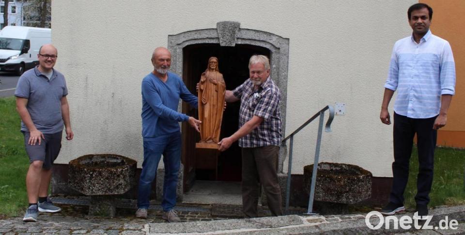 Neben Norbert Henschel bedankten sich auch Pfarrer Pater Anish George und Kirchenpfleger Stefan Kausler bei Bernd Würstl für die gespendete Holzfigur. Wie Besitzer Norbert Henschel erklärte, stehen demnächst einige Sanierungsarbeiten am Dach und an der Außenfassade sowie im Innenraum Malerarbeiten an.