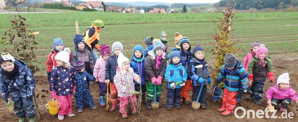 Die kleinsten Gemeindebürger packen bei der Flurneuordnung mit an: Mit Eimerchen und Schaufel ausgerüstet, kamen sie zur Pflanzaktion. In den Ortsteilen Guteneck und Weidenthal läuft die Flurneuordnung. Im Rahmen dieser Maßnahme wurde bereits ein vier Meter breiter und rund 350 langer Schotterweg angelegt. Als Ausgleich für die Natur ist unmittelbar an der Südseite ein dreireihiger, 150 Meter langer Fünfmeterstreifen mit Haselnuss-, Heckenrosen-, Schlehen- und Weidensträuchern anzupflanzen.