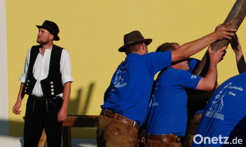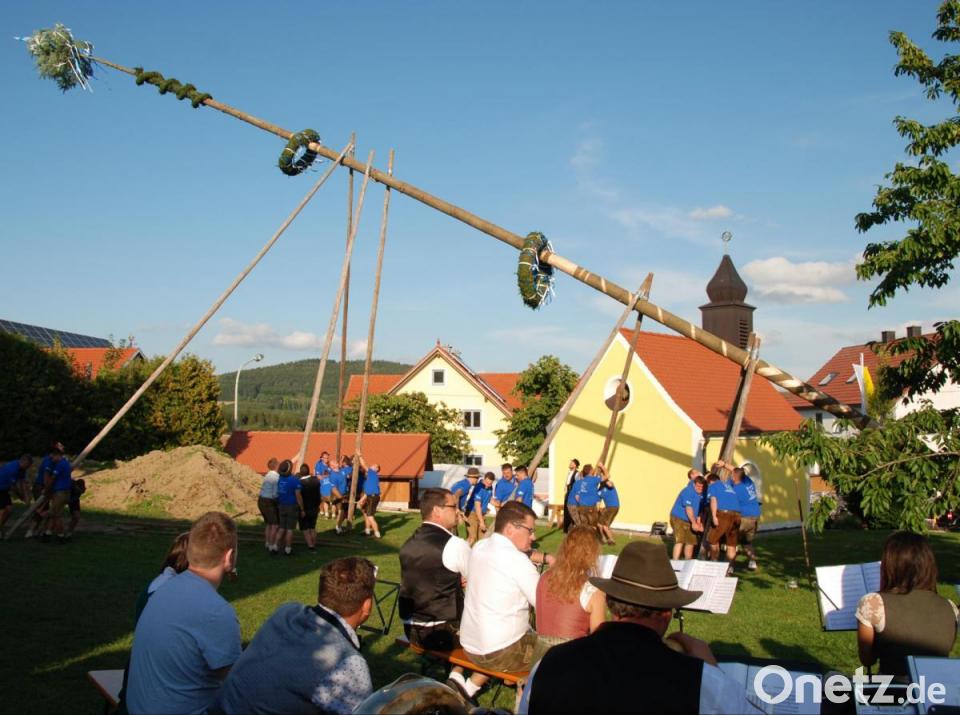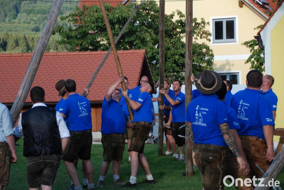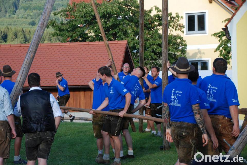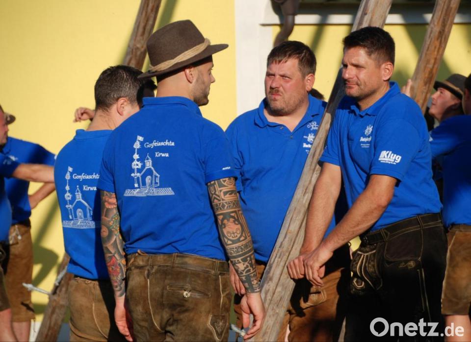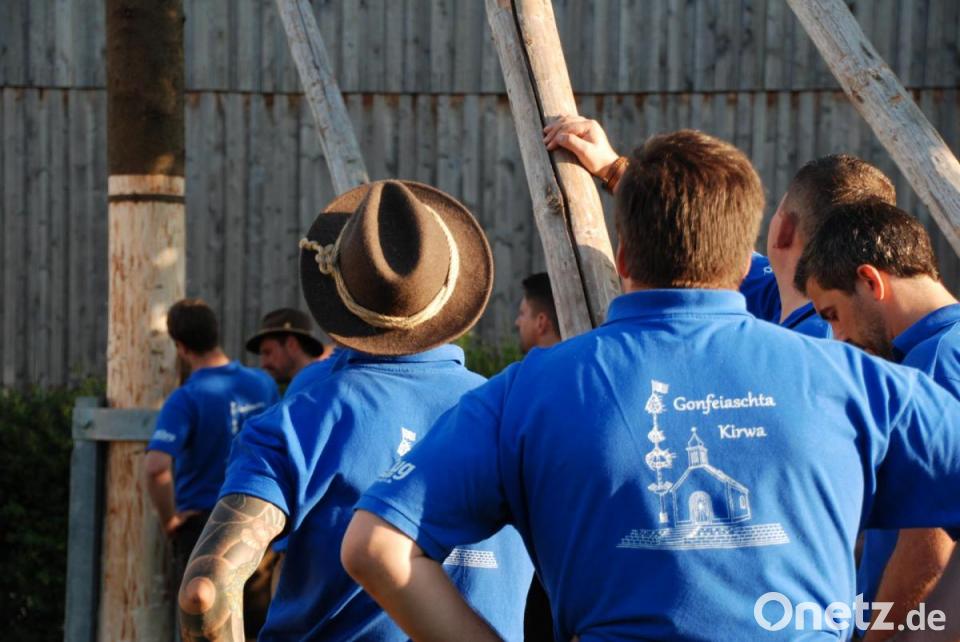 Mit den Worten "Pack mas dann o" ging es zum Aufstellen des knapp 30 Meter langen Baumes zur Wiese oberhalb der Kapelle. Die zahlreichen Zuschauer freuten sich über Blasmusik und die vom Kapellenverein servierten Kuchen und Torten. Das kräftezehrende Aufstellen klappte auch bei der zwölften Kirwa hervorragend. Dabei war den jungen Leuten in Tracht die Freude über das Gemeinschaftswerk anzusehen. Außerdem beflügelte der Kameradschaftsgeist. Schließlich sind die Kirwaleid eine ganze Woche lang mit den Vor- und Nacharbeiten beschäftigt. Die beiden Vorsitzenden der Gonfeiaschta Kirwaleid, Markus Portner und Matthias Meier, dankten dem Kaplan für den festlichen Gottesdienst, musikalisch umrahmt von der vereinseigenen "Kirwablosn".
