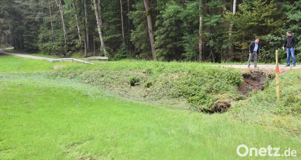 Nicht nur die Regenmengen aus dem Bereich Reinhardsrieth hätten sich über Hagendorf zusätzlich ergossen. Wie Bauriedl und Meier feststellten, hätte sich dazu noch der gesamte Abfluss mit all dem Geröll aus dem Pleysteiner Kaltlohweg gesellt. Wie berichtet, war die erst kürzlich fertiggestellte Straße durch das Unwetter stark in Mitleidenschaft gezogen worden. Bei der Ortsbesichtigung zeigte sich, dass die Wassermassen sich beim Überqueren der Gemeindegrenze zunächst über Äcker und Wiesen in tiefere Geländeeinschnitte ausbreiteten. Das dort im Talgrund Richtung Raunetsbach verlaufende Gewässer, das mit dem Namen Kaltlohbach denselben Namen trägt, wie die Verbindungsstraße nach Miesbrunn, quoll rasend schnell an. Doch auch hier fing eine weitere Straßenböschung zwischen Hagendorf und Reinhardsrieth einen gehörigen Teil des Wassers ab. Ein weit auslaufender See bildete sich im rückwärtigen Bereich in Minutenschnelle.