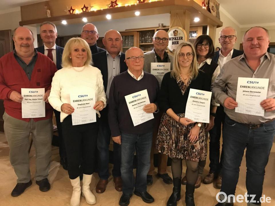 Über den großen Zuspruch zur Feierstunde für langjährige Mitglieder des CSU-Ortsverbands Hahnbach im Gasthof Winkler zeigte sich Vorsitzender Georg Götz "vollkommen überrascht". Eingangs überreichte er an Eduard Freisinger, den Vorsitzenden der Lebenshilfe Amberg, 350 Euro, die beim Adventsmarkt erwirtschaftet worden waren. Als "echte Eckpfeiler" titulierte Götz die elf Jubilare, denen er Ehrenurkunden überreichte. Hans Bernreuter, der alljährlich die geräucherten Bratwürste für den Adventsmarkt herstellt, und der langjährige Beisitzer Hans Luber sind 20 Jahre Mitglied. Nicht anwesend sein konnten Thomas Janouschek, Angelika Anton und Anna Elisabeth Hoffmann, die ein Vierteljahrhundert der CSU angehören. Ebenfalls 25 Jahre ist die Kreisdelegierte Christine Siegert dabei. Peter Iberer brachte es auf 35 Mitgliedsjahre; ebenso Walter Trösch, der lange Beisitzer und auch stellvertretener Vorsitzender war. Auf 40 Jahre können Vorsitzender Georg Götz und Sieglinde Hierl zurückblicken. Das hätte auch für den im September verstorbenen Martin Wild gegolten. Herbert Demleitner, der ehemalige stellvertretende Vorsitzende, Marktrat und heute CSU-Ehrenmitglied, ist seit 55 Jahren dabei und bekam dafür einen starken Sonderapplaus. Georg Götz lobt die "gute und gesunde Mischung" der Hahnbacher CSU-Mitglieder, die nicht nur für ihn "wie eine große Familie" seien. CSU-Kreisvorsitzender Harald Schwartz dankte allen für den guten Wahlkampf, der zu einem großartigen Ergebnis geführt habe. Eine lebhafte Diskussion schloss sich an, in der gefordert wurde, dass Politiker noch mehr Präsenz vor Ort zeigen und sich bezüglich der Koalitionspartner nicht zu früh festlegen sollten.