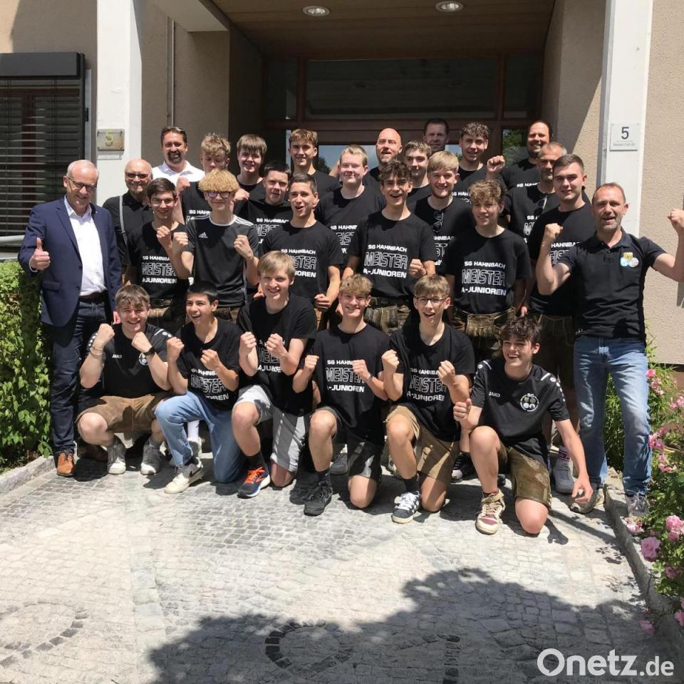 Der Sportverein Hahnbach feierte am Wochenende auch die Spielgemeinschaft seiner Fußball-Junioren. "Seit den 75 Jahren des Vereinsbestehen war diese erst die dritte Mannschaft, welcher dieser Erfolg einer Meisterschaft gelungen ist", betonte Jugendleiter Jörg Lütje. Auch Vorsitzender Hans Luber, Coach Jaro Jungmann und nicht zuletzt Bürgermeister Bernhard Lindner zeigten sich sichtlich stolz auf den 30-köpfigen Kader. Die Betreuer Magnus Deichl, Christian Graf, Bastian Binner und Tobias Schlamberger, die mit viel Engagement zum Erfolg beigetragen haben, freuten sich über die Ehre, sich im Rathaus ins Goldene Buch des Marktes eintragen zu dürfen.