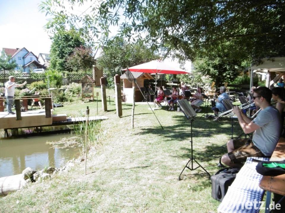 „Karpfen mit Musik“ gab es am Patroziniums-Samstag für die Frohnbergsiedlung. Am Ossisee, so genannt, weil der Besitzer des Fischweihers aus den neuen Bundesländern kam, hatten sich wegen der Corona-Auflagen die Hahnbacher Marktbläser zu einer Freiluftprobe getroffen. Dirigent Benno Englhart leitete die Übungsstunden vom Steg aus, in korrektem Abstand folgte sein Ensemble tapfer den Anweisungen. Dass Proben auch in schwierigen Zeiten stattfinden sollten, war nach dem Lockdown allen Musikern klar. Da aber die Abstandsregeln im Proberaum nicht einzuhalten waren, entschloss man sich zu Open Airs. Schon dreimal probte man auf dem Frohnberg, und zum zweiten Mal trafen sich die Musiker nun am idyllischen Ossisee am Weiherweg. Einmal war man auch am Gemeindeweiher zwischen Fischerhütte, Siedlerbundstadel und BRK-Depot zusammengekommen. Treffpunkt für die nächsten Proben wird wieder der Frohnberg sein, „in bester Hahnbacher Frischluft“, wie es hieß.