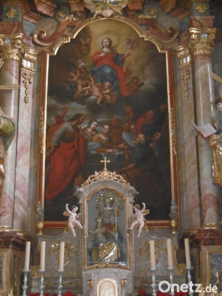 Den Todestag Marias, der Mutter Jesu, feierte man seit dem 5. Jahrhundert. Im Laufe der zunehmenden Marienverehrung wurden die Umstände der "Entschlafung" immer mehr ausgeschmückt. Eindrücklich dargestellt ist dies auch auf dem großen Altarbild in der Frohnbergkirche. Staunend umstehen Frauen und Apostel den leeren Sarg Mariens, welche von Engeln in die Wolken des Himmels getragen wird. Rechter Hand meint man den Apostel Petrus an seinem Bart zu erkennen und links ist es wohl Johannes, der Jünger, der nach Jesu Willen, Maria als Mutter zu sich nahm und der tief berührt die leeren Sargtücher bestaunt.