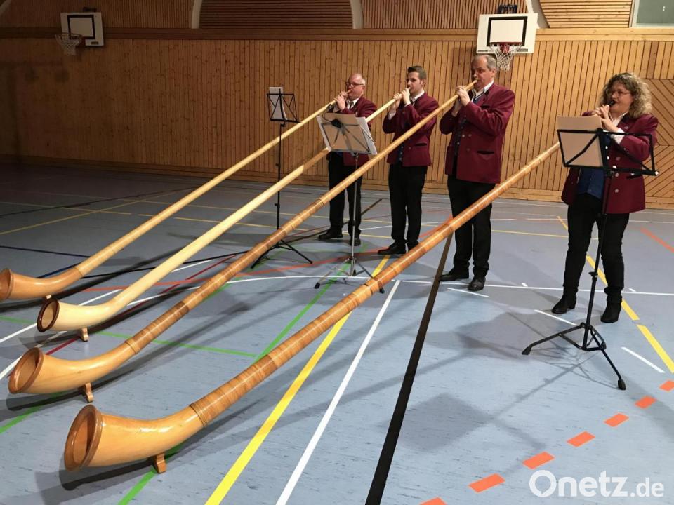 Die große Besetzung der Marktbläser übernahm dann wieder mit einer klangvollen Verneigung vor der „Kaiserin Sissi“. Schwungvoll und hinreißend eroberte der Marsch schnell Ohren und Herzen. Die frische schnörkellose Polka „Ein junger Egerländer“ von Daniel Fischinger kam ebenso mit viel Spielfreude bestens beim Publikum an. „Begegnung“ hieß das Stück des Autodidakten Kurt Gäble für vier Alphörner und das Blasorchester. Sensibel und taktvoll im besten Sinn faszinierten Regina Rester-Achhammer, Matthias Fenk, Jakob und Josef Hofmann auf ihren langen Blechblasinstrumenten jenes „Alpen-Handys“, so der Bürgermeister. Die vier glänzten auch weiter bei der „Alfons Polka“, die dem berühmten Alphornbauer Alfons Neumann gewidmet ist. Feurig, erfrischend spritzig und frech spazierte schließlich der „Maxglaner Zigeunermarsch Reloaded“ durch die Mehrzweckhalle. Vorsitzender Matthias Fenk dankte den Dirigenten Benno Englhart, Jakob Hofmann sowie dem Moderator Bernhard Lindner. Kurz stellte er die große Bandbreite der Marktbläser von den Spätzündern bis hin zur musikalischen Früherziehung vor und lud alle Altersgruppen zum „Töne schnuppern“ ein. Noch drei Zugaben erklatschten sich die Zuhörer, bevor es zum gemütlichen Zusammensein in die Aula ging.