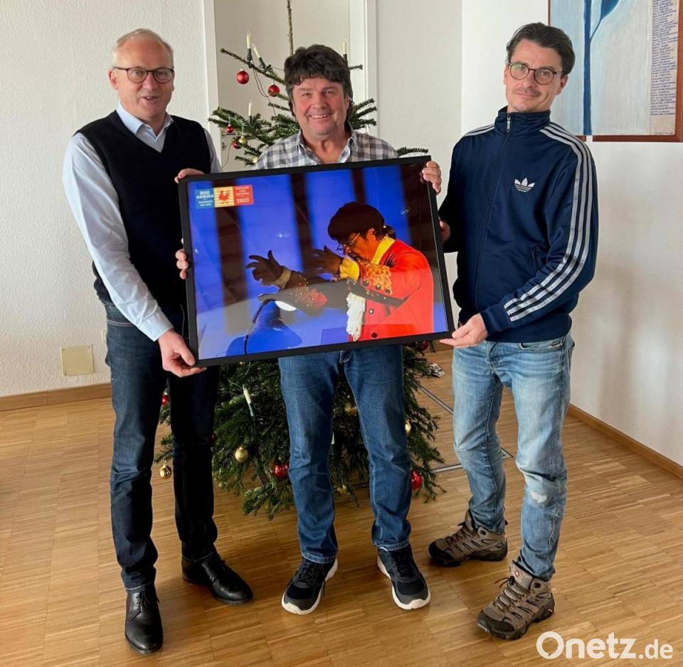 Als das Kreativteam der Hahnbacher 900-samma-Festspiele bei der Jahresabschlusssitzung des Marktgemeinderats geehrt wurde, hatte Gerhard Säm Kraus gefehlt. Die Ehrung mit einem Bildportrait aus den Bildserien des Fotografen Bernd Müller aus Sulzbach-Rosenberg reichten nun Bürgermeister Bernhard Lindner und Festspielleiter Jürgen Huber nach. Das großformatige Bild zeigt Kraus hochkonzentriert beim Dirigieren von Chor und Orchester vor dem Hintergrund des illuminierten Freialtars – ein Bild wie ein Gemälde, waren sich alle einig. Als er Kraus‘ Einsatz beim Festspiel würdigte, stellte Jürgen Huber fest, dass dieses Gesamtwerk ohne dessen musikalischer Begeisterung und Expertise in dieser Form nicht möglich gewesen wäre. „Nur so konnten Musik, Gesang und Schauspiel zu diesem Festspiel verschmelzen“, sagte Bürgermeister Lindner. Die Veranstaltung sei von einem selbstlosen ehrenamtlichen Engagement im gesamten Umfeld des Projekts getragen worden. Säm Kraus nahm sichtlich gerührt diese Auszeichnung entgegen, die einen Ehrenplatz in seinem Studio erhalten werde. Bei einer Tasse Kaffee blickten die drei noch auf manche Festspiel-Anekdote zurück.
