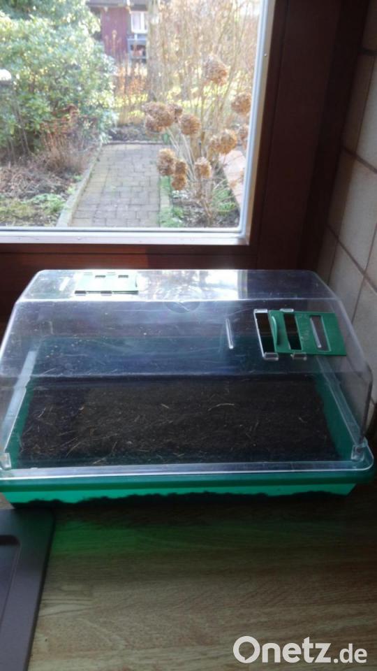 So fülle ich also meine Keimschale mit nährstoffarmer Anzuchterde. Ich könnte auch kleine Pflanztöpfe aus Holzfasern verwenden, die später zusammen mit den Pflanzen ins Beet gesetzt werden. Sie sind frei von Torf und schonen so die Moore. Geeignet sind auch Zellulose-Tabletten, die im Wasser aufquellen oder sogar ausgediente Eierkartons.