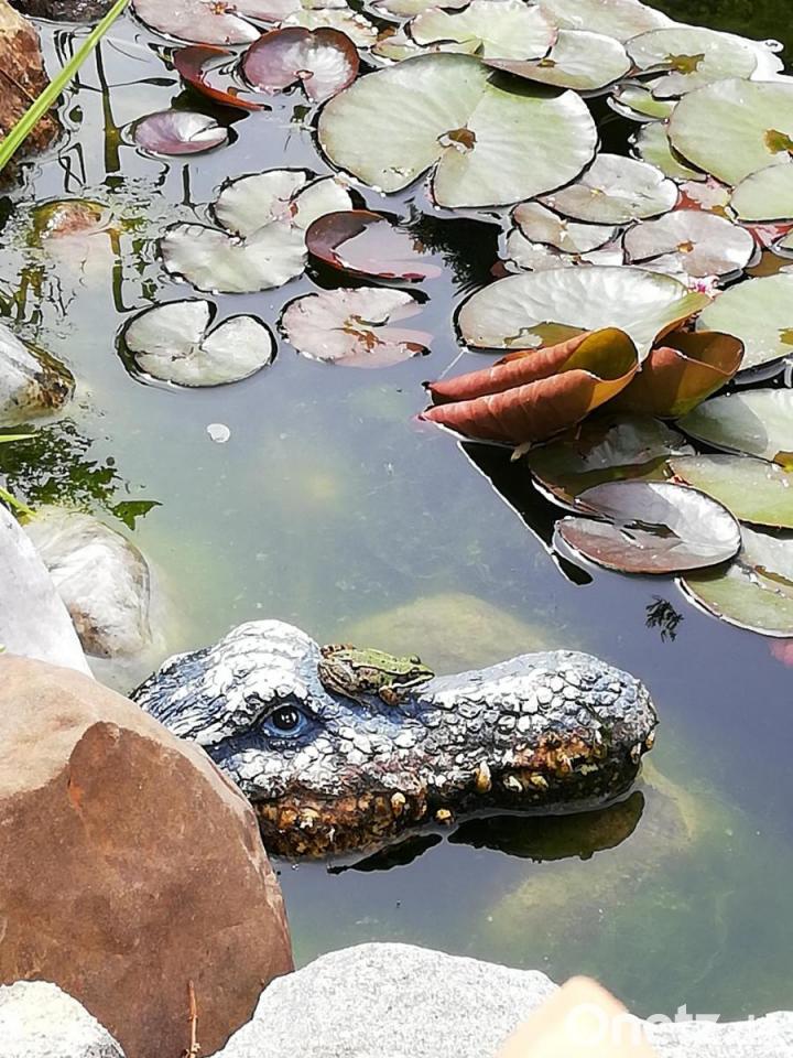 Spontan könnten einem dazu gleich ein paar Redewendungen einfallen, die hier – manchmal etwas abgewandelt – passen könnten. Der „Hecht im Karpfenteich“ könnte zum „Frosch im Koi-Teich“ werden. „Jemandem auf der Nase herumtanzen“ passt eigentlich ganz gut, ebenso „Der Gefahr ins Auge sehen“. Bevor jetzt die große Angst vor Krokodilen in Hahnbach umgeht – der Fotograf und Teichbesitzer wies in seiner E-Mail an die Redaktion ausdrücklich darauf hin, dass nur der Frosch echt ist.