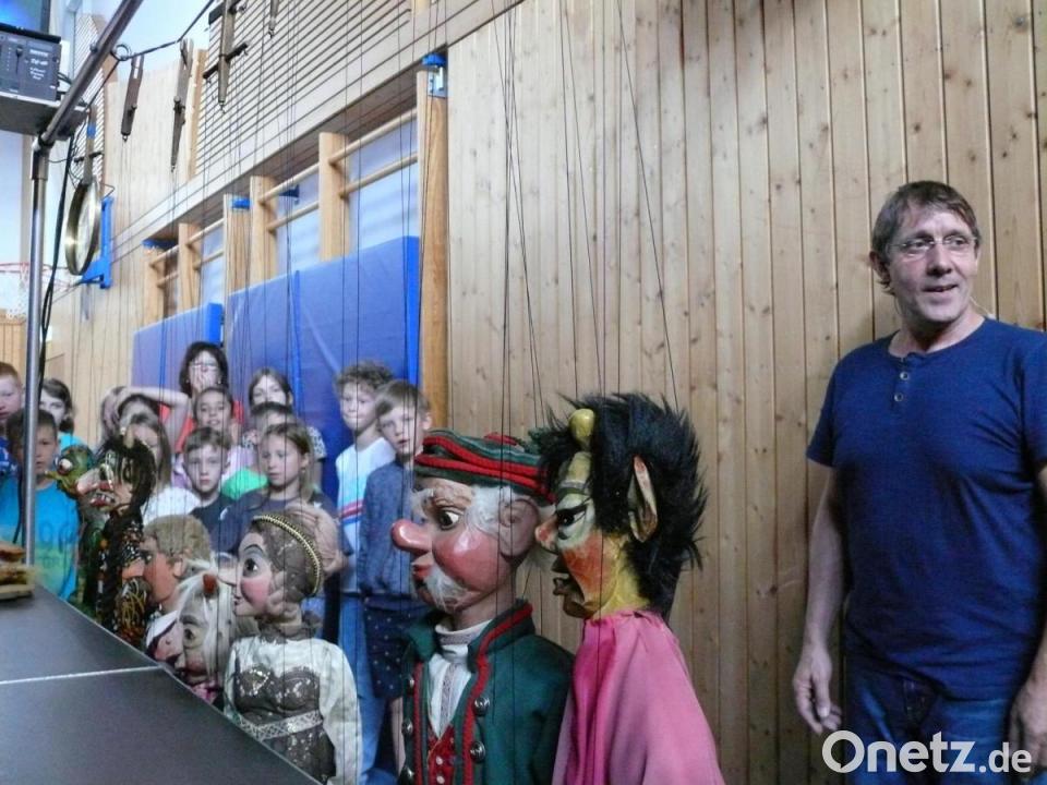 Ausführlich und anschaulich erklärte Andreas Bille den Kindern nach der Vorstellung seine Marionetten und die Technik, die hinter Bild und Ton steckt.