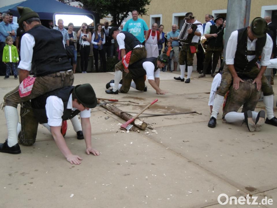 Da wurde zur flotten Akkordeonmusik von Thomas Fenk gesägt und gehackt, dass die Späne nur so flogen. Aber auch die Lederhosen hatten manchen Klatscher vorn und hinten auszuhalten.