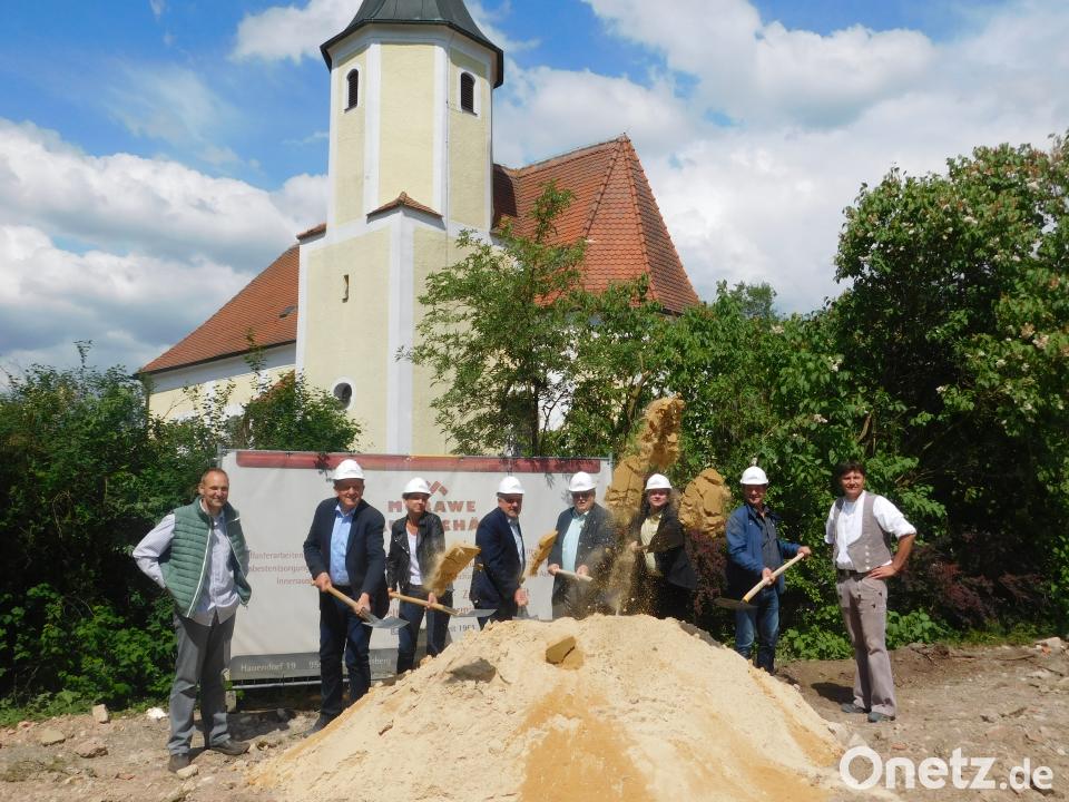 Zum Start des Neubaus der Jugendstätte Haidenaab greifen Stefan Brückner (Landratsamt Bayreuth), Landrat Hermann Hübner, Anja Liebenwald-Zetzmann (Singer-Ingenieur-Consult), Günter Dörfler (ehemaliger Kreisjugendringvorsitzender), der Speichersdorfer Bürgermeister Manfred Porsch, Kreisjugendring-Vorsitzender Christian Porsch, Andreas König (Landratsamt Bayreuth) und Sebastian Morawe (von links) vom gleichnamigen Baugeschäft zum Spaten.