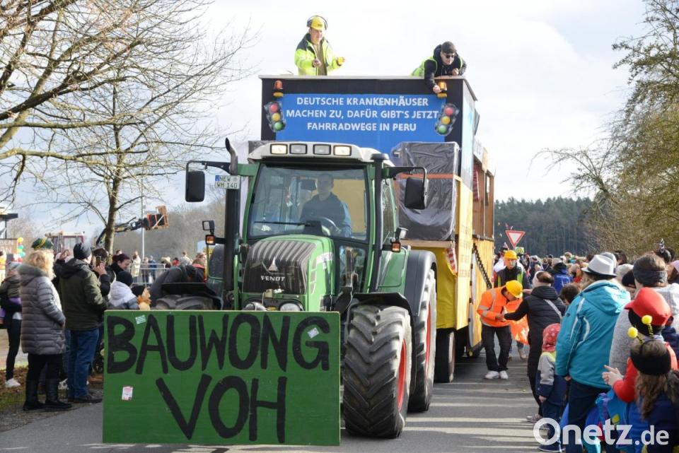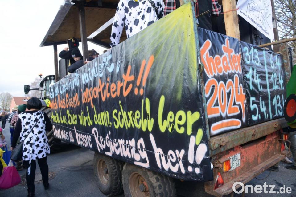 Themen der zahlreichen Motivwagen waren unter anderem die Bauernproteste, die Probleme der Krankenhäuser ("Deutsche Krankenhäuser machen zu. Dafür gibt´s jetzt Fahrradwege in Peru") im ländlichen Raum oder das Bürgergeld, das bei Fortbestand dieser Bundesregierung dankend angenommen werde.