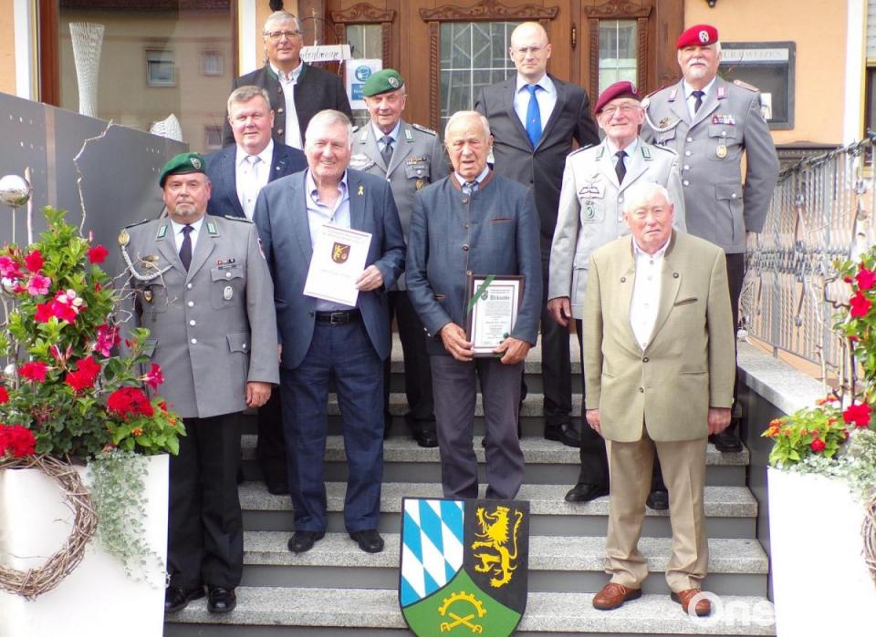 Anschließend überreichte der Vorsitzende, Oberstabsfeldwebel d. R. Josef Niedermeier, an den Altlandrat die Ernennungsurkunde zum Ehrenmitglied und die damit verbundene Kameradschafts-Ehrennadel in Gold des Traditionsverbandes Sicherungsbataillon 48. Zur Begründung der Ehrenmitgliedschaft führte Niedermeier aus, dass der Geehrte aufgrund seiner 24-jährigen Amtszeit als Landrat auch im Katastrophenschutz und somit auch für die Sicherheit und Schutz der Landkreisbürger verantwortlich gewesen sei.