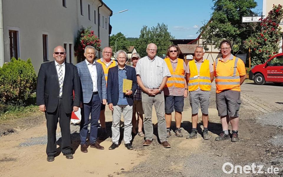 Beim Beginn der Straßenbauarbeiten in Hardeck: Bürgermeister Klaus Meyer, IKOM-Stiftland-Vorsitzender Roland Grillmeier, Klärwärter Reinhold Bauer, Abteilungsleiter Gerhard Kederer vom Staatl. Bauamt, der ehemalige Bauhofleiter Josef Schnurer als Anlieger, Baudirektor Henner Wasmuth vom Staatl. Bauamt, Stefan Männer, Bauleiter der Fa. Roth, Bauleiter Hans Gschrey vom Staatlichen Bauamt und Wasserwart Konrad Hart (von links).