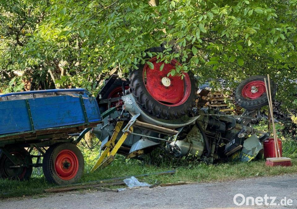 Das Gespann hatte Hartenstein noch nicht verlassen, als es zum Unfall kam. Auf einer kleinen, abschüssigen, asphaltierten Straße verlor der Bulldogfahrer nach Angaben der Polizei Hersbruck die Kontrolle über das Fahrzeug. In einer Rechtskurve kippte der Traktor um und überschlug sich mehrfach.