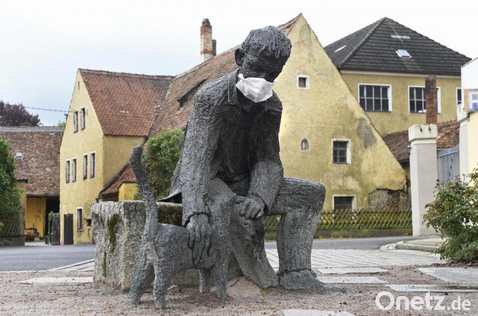 Ein Ruhe suchender Bürger, zu dem sich eine Katze gesellt. Der Schlossplatz in Haselmühl erfuhr im Jahre 2004 durch die von Künstlerin Sabine Mädl geschaffene Skulptur eine optische und künstlerische Aufwertung. Insbesondere der Mann wird gerne mal - je nach Jahreszeit oder Lust und Laune - verziert. Klar, dass es nicht lange dauerte, bis auch dem Mann eine Mund-Nasen-Maske übergestülpt wurde. Corona lässt grüßen, oder schützt sich der alte Mann nur vor seiner lästigen aber harmlosen Katzenhaarallergie? Nix Genaues weiß man nicht. Er spricht nicht gerne darüber.