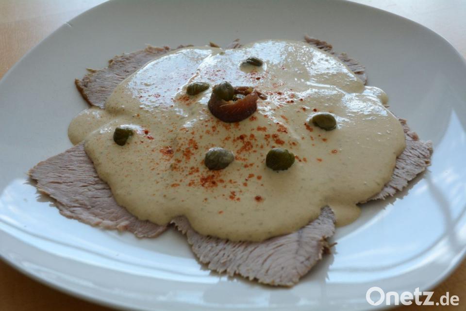 Das nun kalte Fleisch in dünne Scheiben schneiden und anrichten. Die Thunfischsauce darüber verteilen und etwa zwei Stunden kühl stellen. Mit Kapern und Paprikapulver garnieren und servieren.