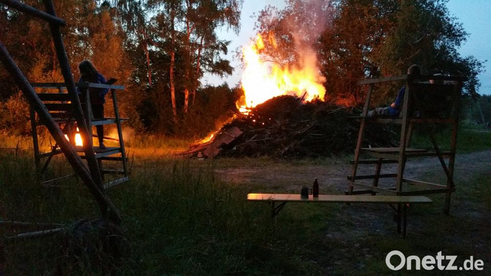 Übrigens brannte noch ein zweites, kleineres Johannisfeuer, das die zukünftigen Organisatoren entzündet hatten. Als Zuschauertribüne dienten den Mädchen und Buben Jagdkanzeln, die dankenswerter Weise Jagdpächter Rudi Gräbner zur Verfügung hatte.