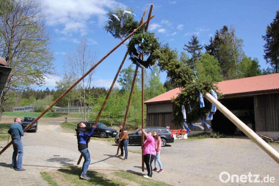Seit rund 16 Jahren stellt die Familie Schmidkonz einen Maibaum in Beierfeld auf. "Anfangs haben wir das für die Kinder gemacht", erzählt Gabi Schmidkonz. Mittlerweile sind ihre vier Kinder erwachsen. Das Maibaumaufstellen führt die aber Familie fort. Nach den ersten Jahren wurde die Aktion immer größer, so dass es seit über zehn Jahren ein Fest mit rund 200 Besuchern in der Ortschaft mit drei Anwesen gibt. "Es ist nie ein großer Maibaum, vielleicht so rund elf Meter hoch. Aber er ist immer schön anzuschauen", sagt die Organisatorin. Auch heuer wollte die 42-Jährige mit ihrer Familie in Beierfeld traditionsgemäß einen Maibaum aufstellen - trotz Corona. "Als Familie dürfen wir da ja zusammenhelfen", sagt sie. Ein Stück Normalität für die Beierfelder in dieser besonderen Zeit. Nur das Fest mit Familie, Nachbarn, Freunden und Bekannten dazu müsse dieses Jahr ausfallen. Aufgerichtet wurde der Maibaum aus dem eigenen Wald traditionell am 1. Mai zur Mittagszeit, heuer erstmals mit Schwalben, geliehen aus dem Nachbarort, statt mit dem Bulldogs.