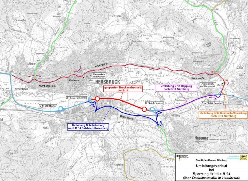 Die Umleitungsstrecken sind aus der beigefügten Karte ersichtlich: 1.) B14-Verkehr in Richtung Sulzbach-Rosenberg: Der Verkehr der B 14 aus Richtung Nürnberg kommend wird unmittelbar an der B 14-Brücke ausgeleitet, dann auf der Ostbahnstraße, Leutenbachstraße und rechts über die Sandgasse und Bauerngasse durch Hersbruck geführt. Über eine Ortsverbindungsstraße wird dann die Staatsstraße 2236 bei Happurg und schließlich wieder die Bundesstraße 14 erreicht. Die bestehende 30-km/h-Regelung in der Bauerngasse bleibt bestehen, zusätzlich wird die zulässige Geschwindigkeit zwischen der Bauerngasse und Happurg zur Verbesserung der Verkehrssicherheit während der Umleitung reduziert.