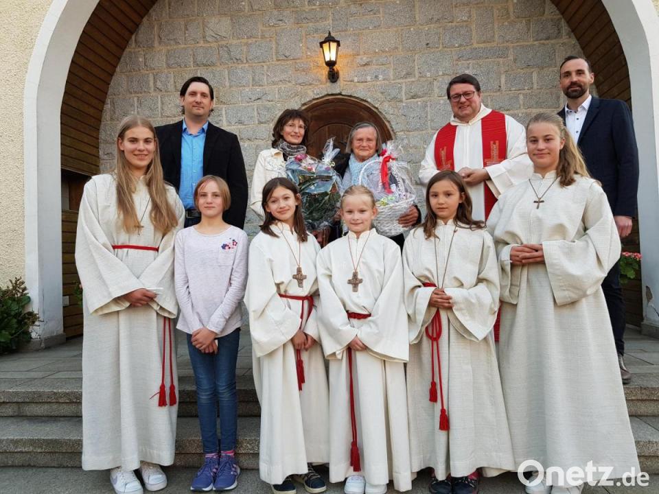 Margarete Hoch (hinten, Dritte von rechts) wurde nach 42 Jahren Dienst als Mesnerin verabschiedet. Als neue Mesnerin hat sich Rita Bauer (hinten, Zweite von links) bereit erklärt. Dazu dankten und gratulierten Ortssprecher Thomas Kleber, Pfarrer Udo Klösel und Bürgermeister Armin Bulenda (von links).