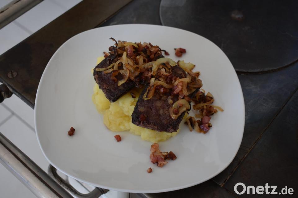 Himmel und Ääd auf vorgewärmte Teller geben, Speck und Zwiebel darauf verteilen und die gebratene Blutwurst dazu geben. Tipp: Der Kartoffelstampf und das stückige Apfelmus kann auch getrennt serviert werden. (nd)