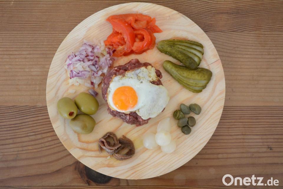 "Beefsteak tatare ist fast so stark an Gnade wie ein am Grill gebratnes Lendenstück." Diese Schwärmerei stammt von dem Dramatiker Carl Zuckmayer ("Des Teufels General"). Er setzte dem Gericht in seinem gereimten Essay "Das Essen" ein literarisches Denkmal. Benannt worden soll das Tatar nach den Tataren sein, die angeblich das rohe Fleisch für ihre Mahlzeiten unter dem Sattel weich ritten. Zubereitung:Das Fleisch faschieren und mit den zwei Eigelb vermischen. In die Mitte eines Tellers oder Holzbretts legen. Rundherum kleine Häufchen von fein gewürfelten Zwiebeln, Sardellenringen, aufgefächerte oder gewürfelte Gewürzgürkchen, Kapern, Oliven und Paprikastreifen garnieren. Mit einem Petersilienzweig dekorieren. Worcestersauce, Cognac, Salz, Pfeffer aus der Mühle und Paprika separat dazu reichen. So kann sich keiner sein Fleisch nach eigenem Gusto abschmecken. Zum Schluss gekrönt wird das Tatar mit zwei Wachtel- oder Hühnerspiegeleiern.