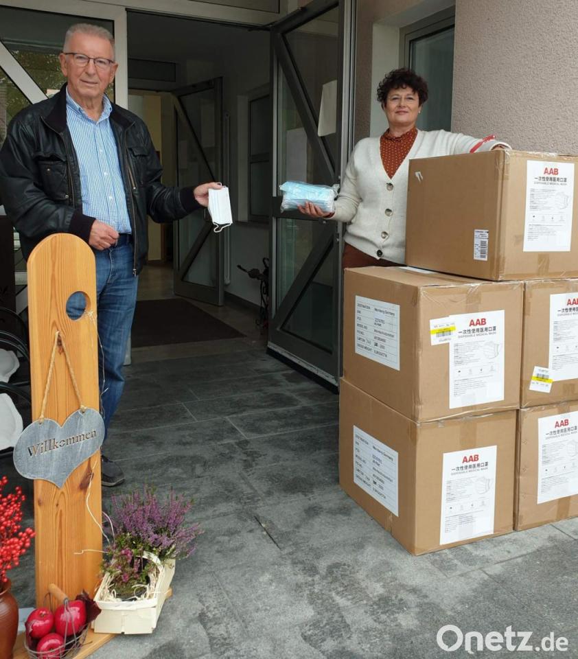 Um sowohl die Bewohner des Seniorenheims St. Barbara als auch die Besucher vor einer Ansteckung mit dem Coronavirus zu schützen, spendet Klaus Conrad dem Heim 10 000 Schutzmasken. Der Seniorenbeauftragte der Stadt, Stadtrat Rudi Wild (links), überreicht sie in seinem Namen an Heimleiterin Astrid Geitner (rechts).