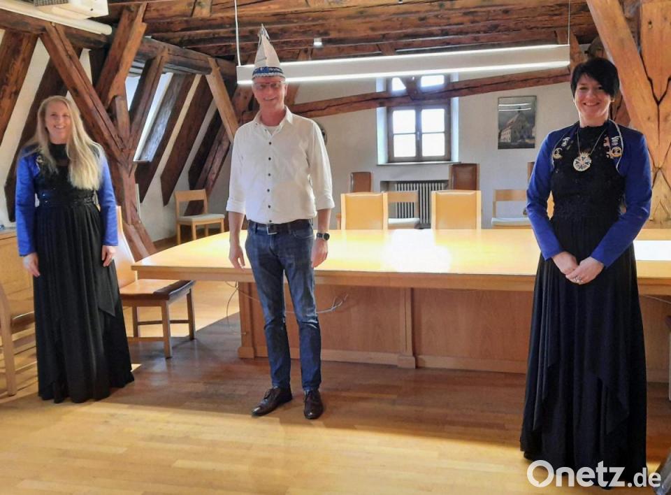 Ganz und gar auf eine offizielle Eröffnung des Faschings wollte Regina Merkl jedoch nicht verzichten und dem Rathaus-Chef einen Überraschungsbesuch abstatten. Unter dem Allerweltsnamen Meier ließ sie im Vorzimmer von Bürgermeister Hermann Falk einen Besuchstermin reservieren. Das Stadtoberhaupt roch allerdings den Braten. Im Bewusstsein, weder Rathausschlüssel noch Stadtkasse abliefern zu müssen, hieß er das Präsidentinnen-Duo schmunzelnd im Sitzungssaal willkommen. Die Narrhalla-Chefinnen trugen es mit Fassung und überreichtem ihm eine sehr edel gestaltete Narrenkappe, wie sie sonst nur die Elferrat-Mitglieder tragen. Aufsetzen musste sich diese der Bürgermeister freilich selber, und Küsschen gab es für ihn auch nicht.